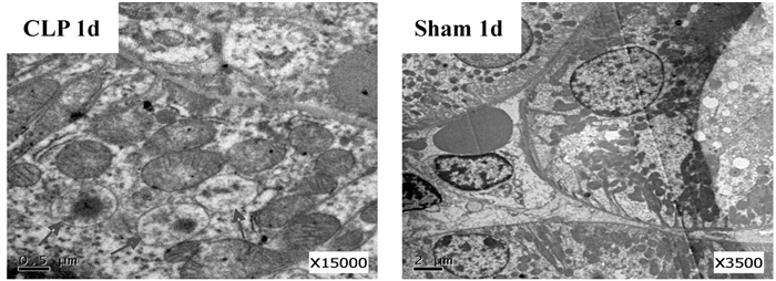 | 图 4 CLP组和假手术组术后1 d小鼠肾脏的电镜超微结构改变 Figure 4 The ultrastructural chang of mice kidney tissue on 1 d after CLP between CLP and假手术group by electron microscope |