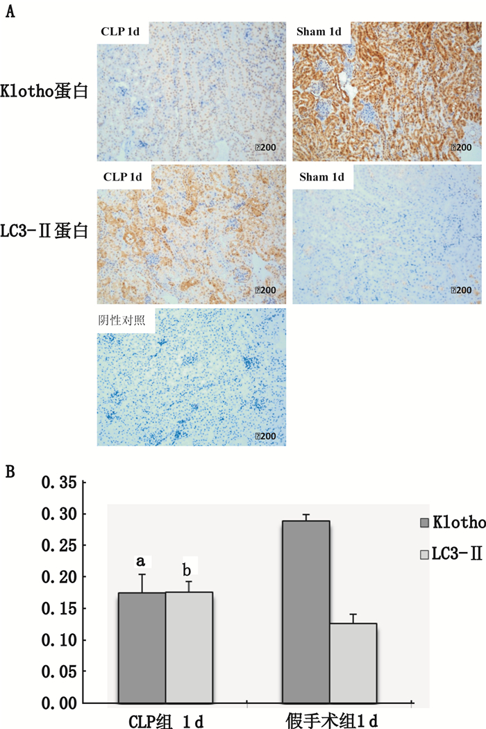免疫组化显示Klotho蛋白和LC3-Ⅱ蛋白主要分布于小鼠肾小管胞浆内。CLP术后1 d,Klohto蛋白明显减弱,LC3-Ⅱ蛋白明显增浓,与假手术组相比差异具有统计学意义 (P < 0.01)(见图 5)。(Klotho蛋白表达:与假手术组相比,t=-8.371, P < 0.01;LC3-Ⅱ蛋白表达:与假手术组相比,t=4.995, P=0.001)。