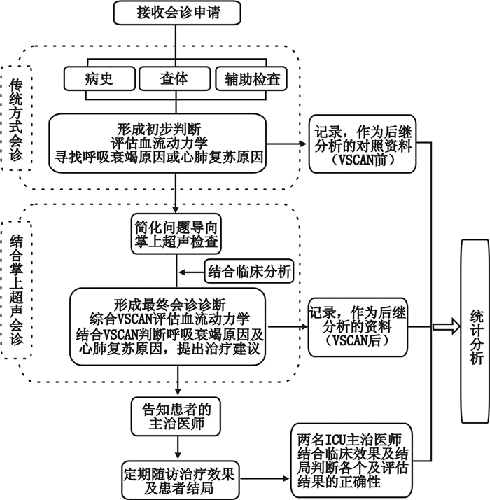 1.2 设计及方法前瞻性研究。在接到会诊请求后,接受重症超声培训并有3个月使用经验的ICU医师携掌上超声 (VSCAN) 进行会诊。试验流程为:(1) 先按照传统方式进行会诊 (结合病史、查体及现有的辅助检查,初步诊断病情加重的原因,并重点进行血流动力学评估及呼吸衰竭原因判断;对于心肺复苏者除指导抢救外,还要分析抢救原因)。记录初步诊断、血流动力学评估结果、呼吸衰竭原因及抢救原因等数据,作为后继统计分析的对照组资料 (VSCAN检查前),不作临床使用。(2) 然后使用VSCAN进行目标导向检查,结合临床分析超声检查结果,形成最终的会诊意见,包括最终诊断、血流动力学状况、呼吸状况及治疗建议。记录会诊意见,作为后继统计分析的研究组资料 (VSCAN检查后),并将会诊意见告知患者的原主治医师,主治医师结合病情决定治疗的实施。ICU医师指导其开始治疗后会诊完成,并定期随访治疗效果及患者的结局。见图 1。