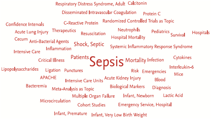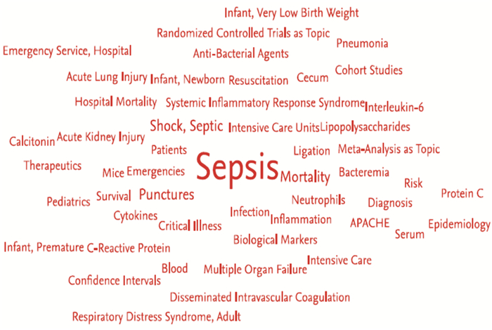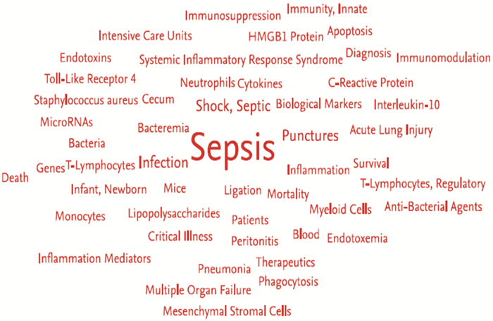 本研究选择Web of Science (WoS) 和Incites作为数据分析源,所获取的WOS论文数据截至2017年4月1日,检索时间:2017年4月1日。纳入的文献类型:Article和Review。数据基础:根据sepsis相关主题词制定检索式,锁定该领域研究论文集。分析工具:SciVal和CiteSpace。基于SciVal分析平台,通过使用自然语言处理技术 (nature language processing) 对导入的文献标题及摘要进行文本挖掘来发现重要的主题概念。这些主题概念都被收录在跨学科的主题词表系统之中。对于每篇文献来说,通过倒序词频 (inverse document frequency,IDF) 的方法平衡文献中主题概念的出现频率与重要性之间的关系,从而在每个研究领域中筛选出前50个具有最高词汇权重的词语作为关键词语。其中字体越大,表示该关键词出现的频次越多。