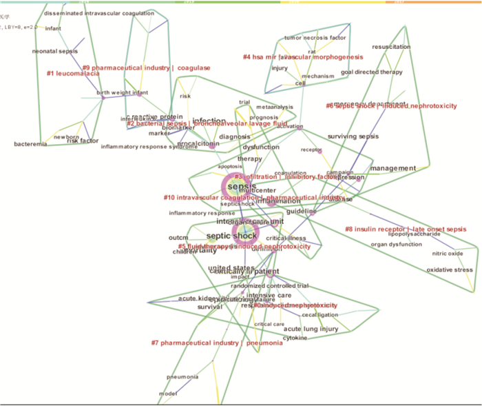 #1-#10为未来研究的10大热点主题 图 7 脓毒症临床研究文献关键词聚类网络 (2011至2017)