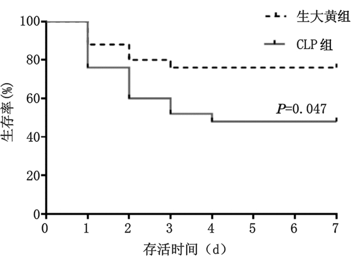 CLP组大鼠生存率为48.0%,生大黄组大鼠生存率为76.0%,生大黄组高于CLP组,差异具有统计学意义 (P=0.047)。大鼠死亡高峰期在术后48 h内 (图 1)。