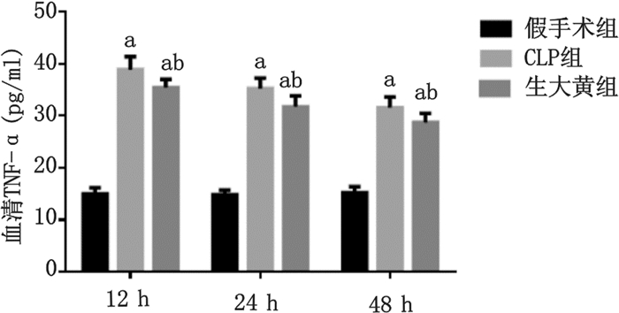 与假手术组比较,aP<0.01 ;与CLP组比较,bP<0.05 图 2 三组大鼠血清TNF-α水平 Figure 2 Serum levels of TNF-α of three groups