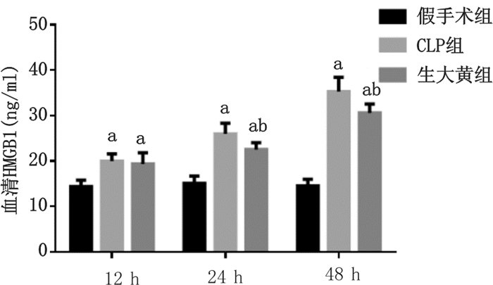 与假手术组比较,aP<0.01 ;与CLP组比较,bP<0.05 图 3 三组大鼠血清HMGB1水平 Figure 3 Serum levels of HMGB1 of three groups