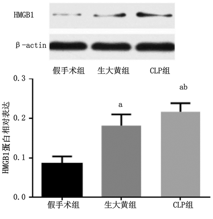 与假手术组比较,aP<0.01 ;与生大黄组比较,bP<0.05 图 4 三组大鼠48 h小肠组织HMGB1蛋白 Figure 4 Expression of HMGB1 protein in small intestine tissue at 48 hours after operation of three groups