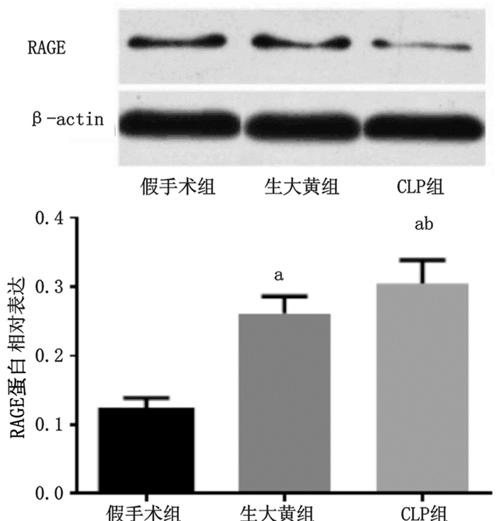与假手术组比较,aP<0.01 ;与生大黄组比较,bP<0.05 图 5 三组大鼠48 h小肠组织RAGE蛋白 Figure 5 Expression of RAGE protein in small intestine tissue at 48 hours after operation of three groups