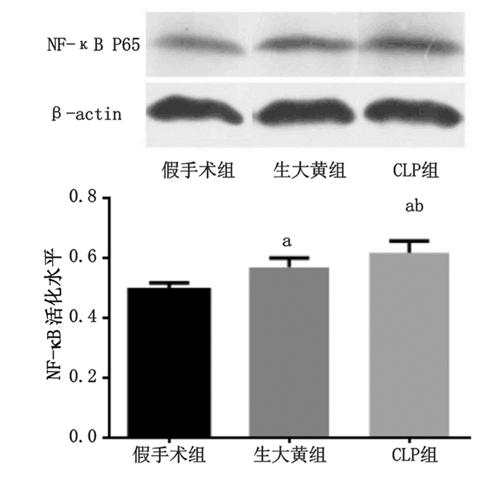 与假手术组比较,aP<0.01 ;与生大黄组比较,bP<0.05 图 6 三组大鼠48 h小肠组织NF-κB 活化水平 Figure 6 Activation of NF-κB in small intestine tissue at 48 hours after operation of three groups