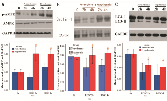 ROSC后亚低温治疗增加大脑皮层内p-AMPK水平 (A),增加自噬标志物Beclin-1表达 (B) 和LC3-Ⅱ/LC3-Ⅰ比例 (C),显著高于常温治疗组。aP < 0.05,bP < 0.01,O为正常大鼠,2 h和4 h分别为ROSC后2 h和4 h 图 1 亚低温对p-AMPK和自噬标志物LC3表达的影响 Figure 1 Effects of mild hypothermia on the expression of p-AMPK and autophagy marker LC3