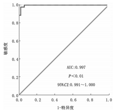 ROC曲线下面积为0.997,面积标准误为0.003,P<0.01, 95%CI:0.991~1.000;最佳截断值为1.095 μg/mL;当D-二聚体质量浓度>1.095 μg/mL时,敏感度、特异度、阳性预测值、阴性预测值、阳性似然比和阴性似然比分别为97.7%、98.0%、97.7%、98.0%、48.86和0.02;当D-二聚体质量浓度>0.5 μg/mL (即D-二聚体检测试验阳性) 时,敏感度、特异度、阳性预测值、阴性预测值、阳性似然比和阴性似然比分别为100%、86.0%、86.3%、100%、7.14和1.16,见表 2, 图 1