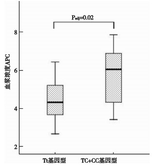 rs1799809位于PC基因的启动子区域,影响PC基因的表达。研究收集51例ARDS患者入院24 h内的血浆,TT、TC和CC基因型的患者分别为37例、12例和2例。结果发现携带基因型TT的患者血浆中APC的浓度明显低于基因型TC和CC的患者[(4.47 ± 0.99)μg/L vs.(5.83 ± 1.45)μg/L,P=0.006) (见图 1),Logistic回归分析去除年龄、APACHE Ⅱ评分等混杂因素后,差异具有统计学意义 (Padj=0.02)。