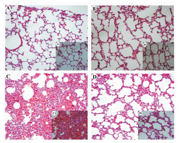 2 结果 2.1 肺组织的病理学变化及评分健康对照组及丙咪嗪组肺组织病理学为肺结构清晰,肺泡间隔薄,无明显红细胞及炎症细胞浸润。LPS注射12 h后,肺组织结构破坏明显,肺泡间隔增厚,肺泡腔内有大量红细胞及炎性介质浸润。LPS+丙咪嗪组,上述肺组织改变均有明显改善,如图 1所示。随机选取10个视野观察并评分,病理评分见表 2。病理评分结果显示,各组间评分差异具有统计学意义 (F=323.1,P < 0.01),LPS+丙咪嗪组小鼠病理评分 (9.22±0.21) 较LPS组 (11.23±0.55) 降低,差异具有统计学意义 (P < 0.05)。