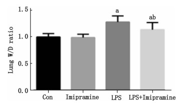 如图 2所示,设置健康对照组W/D比值为1,其他3组取相对值。各组间差异具有统计学意义 (F=20.33,P=0.02),LPS组肺水肿程度最严重,LPS+丙咪嗪组肺水肿程度较LPS组减轻,减轻程度差异具有统计学意义 (P < 0.05)。
