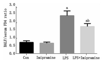 各组小鼠肺泡上皮细胞通透性的测定结果,见图 3,各组间差异具有统计学意义 (F=61.49,P < 0.001)。LPS+丙咪嗪组较LPS组相比,BALF/血清FD4比值下降,差异具有统计学意义 (P < 0.05)。