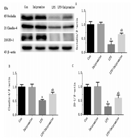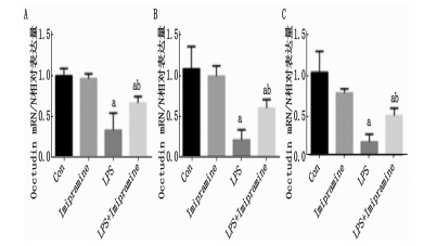 Real-time PCR结果见图 4,各组间紧密连接蛋白的mRNA表达差异具有统计学意义 (Occludin:F=18.62,P < 0.05;Claudin-4:F=16.26,P < 0.05;ZO-1:F=18.74,P < 0.05)。经LSD-t检验,结果发现LPS+丙咪嗪组较LPS组相比,各紧密连接蛋白 (Claudin-4、ZO-1) mRNA的表达均增加,差异均有统计学意义 (均P < 0.05)。