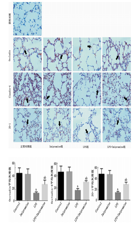 免疫组织化学结果见图 6,Occludin、Claudin-4蛋白主要位于在肺泡上皮细胞膜,表达呈棕黄色;ZO-1主要位于肺泡上皮细胞胞浆内,表达呈棕黄色。LPS组较健康对照组相比,紧密连接蛋白表达显著减少 (Occludin:P < 0.05; Claudin-4: P < 0.05; ZO-1: P < 0.05),LPS+丙咪嗪组较LPS组相比,各紧密连接蛋白表达有所恢复 (Occludin:P < 0.05; Claudin-4: P < 0.05; ZO-1: P < 0.05)。
