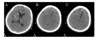 | 基底节水平 (A):1为胼胝体膝部,2为尾状核,3为壳核,4为内囊后肢;半卵圆中心 (B) 和高凸性水平 (C):5、7为灰质,6、8为白质 图 1 头颅CT双侧圆形目的区域的选择 Figure 1 Circular regions of interest were placed bilaterally on brain computed tomography |