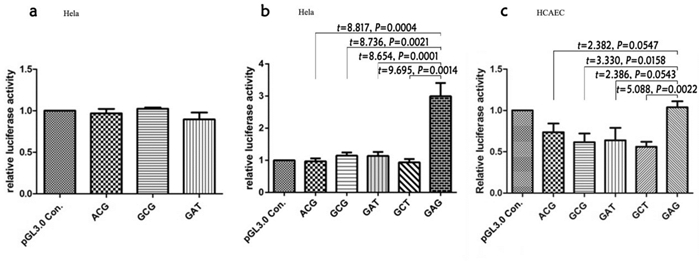 在两种细胞中3个组成型单倍型的转录活性之间相比较差异仍无统计学意义(P>0.05)(见图 1B、1C)。在Hela细胞中GAG单倍型启动子活性与其他四个单倍型活性比较,差异皆有统计学意义(P<0.01),另一种突变单倍型GCT在hela细胞中的转录活性与GCG、GAT型单倍型活性比较差异无统计学意义(P>0.05),所有组间比较采用非参数Kruskal-Wallis秩和检验,差异具有统计学意义(P=0.010 6)(见图 1B);在HCAEC细胞中GAG单倍型启动子活性与ACG、GCG、GCT单倍型活性比较差异有统计学意义(P<0.05),GCT单倍型的转录活性与组成型单倍型活性比较无统计学意义(P>0.05),所有组间比较采用单因素方差分析,差异具有统计学意义(F=4.72,P=0.006 3)(见图 1C)。