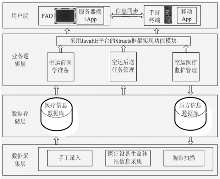 直升机医疗后送信息管理系统总体架构如图 1所示,包括用户层、业务逻辑层、数据存储层及数据采集层。