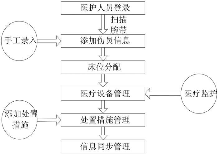 直升机医疗后送信息管理系统的操作方法如图 2所示。医护人员登录系统后,通过手持终端扫描或手工录入伤员信息。按照上述流程空运前对伤员进行检查、处置和后送分类。对于符合空运条件的伤员发起后送申请,审核通过后对伤员进行床位(如ICU担架、立式监护单元)分配,并连接机载医疗设备。转运过程中,可添加医疗处置和监测信息,如机上输液、机上用药和生命体征等。转运完成后,进行信息同步管理,上传医疗数据到后方管理平台。