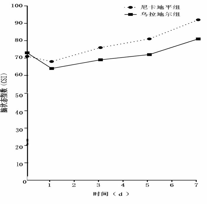 如表 3所示,尼卡地平组与乌拉地尔组在入院时CSI差异无统计学意义[(71±13) 和(73±15),P=0.09];两组在第1天后CSI有一过性下降,之后逐渐回升,第3、5、7天两组间CSI差异均有统计学意义(P=0.04、0.01和0.000 2)。进一步行重复测量方差分析,结果显示,时间效应差异有统计学意义(F=1 291.851,P<0.01),时间与分组存在交互效应(F=59.153,P<0.01),组间的CSI随时间变化趋势不同(F=1 581.115,P<0.01),见图 1。