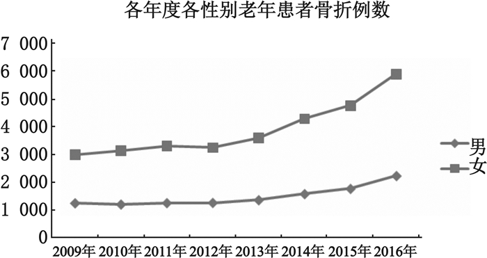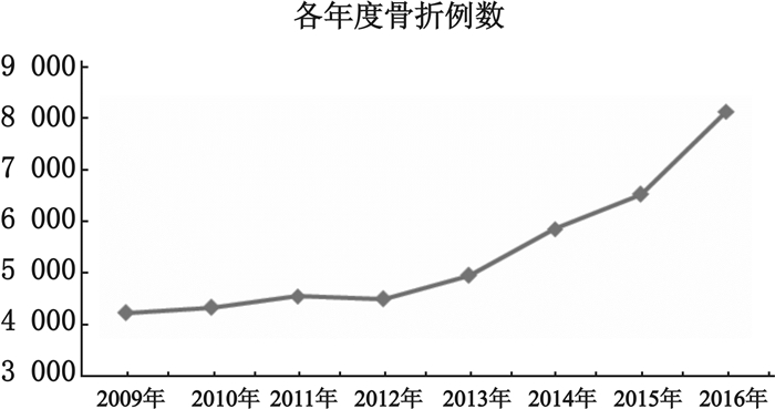 2 结果 2.1 骨折患者概况2009年至2016年老年骨折患者42 988例,2009年至2016年骨折患者分别为4 214例、4 323例、4 538例、4 493例、4 938例、5 846例、6 514例及8 122例(图 1),患者骨折例数逐年增加(P<0.01)。