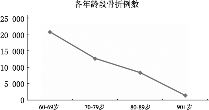 | 老年患者骨折人数随年龄增加而减少(P<0.01) 图 2 各年龄段老年患者骨折例数 Figure 2 The number of elderly patients with fractures by age |
