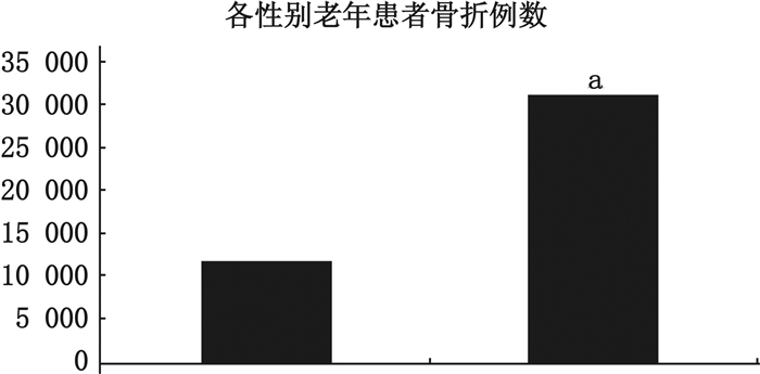 | 与男性患者比较, aP<0.01 图 4 各性别老年患者骨折例数 Figure 4 The number of elderly patients with fractures by gender |