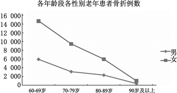 | 男女患者均随年龄段增加而递减(P<0.01),各年龄段男性患者均低于女性(P<0.01) 图 6 各年龄段各性别老年患者骨折例数 Figure 6 The number of elderly male patients and elderly male patients with fractures by age |
