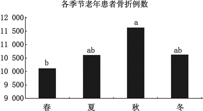 | 与春季患者相比较,aP<0.01,与秋季患者相比较,bP<0.01 图 7 各季节老年患者骨折例数 Figure 7 The number of elderly patients with fractures by season |