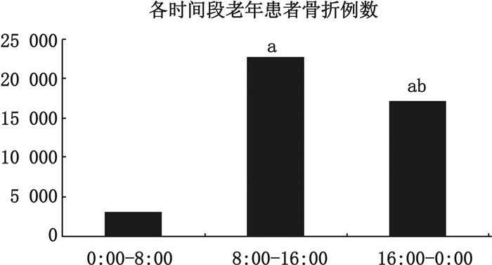 | 与0:00-8:00时间段相比较,aP<0.01;与8:00-16:00时间段相比较,bP<0.01 图 8 各时间段老年患者骨折例数 Figure 8 The number of elderly patients with fractures by time |