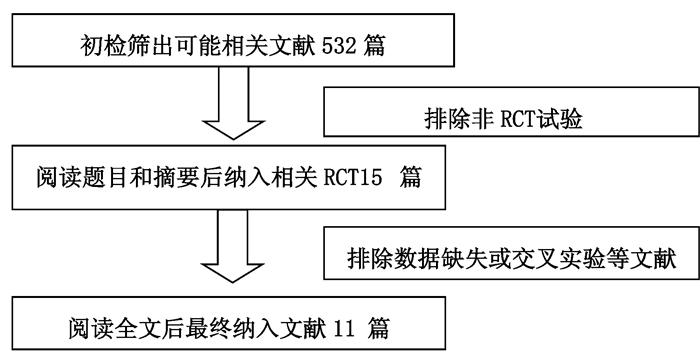 2 结果 2.1 文献检索结果 2.1.1 检索流程通过对各大中、英文数据库进行细致的检索,初筛出可能相关的文献532篇,排除非RCT研究后,阅读剩下的相关论文的题目与摘要,检出相关RCT研究15篇,仔细阅读全文排除数据缺失或错误的文献后,最终纳入11篇文献(图 1)。
