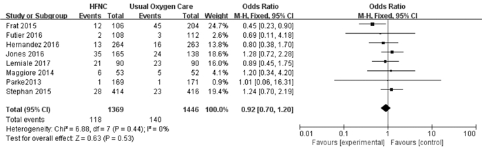 8篇文献对HFNC与UOC治疗后病死率做了统计,二者异质性,无统计学意义(P=0.44, I2=0),OR=0.92,95%CI: 0.70~1.2,二者在病死率上差异无统计学意义(图 3)。