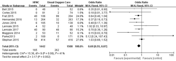 10篇文献对HFNC与UOC治疗后病死率做了统计,二者异质性无统计学意义(P=0.08, I2=41%),OR=0.69,95%CI: 0.55~0.87。统计分析:因可信区间不包含1,故认为HFNC组插管发生率低于UOC组(图 4)。