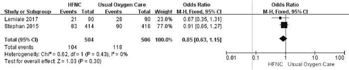 2篇文献对HFNC与UOC治疗后病死率做了统计,二者异质性无统计学意义(P=0.43, I2=0),OR=0.85,95%CI: 0.63~1.15。统计分析:因可信区间包含1,表明二者在院感发生率差异无统计学意义(图 5)。