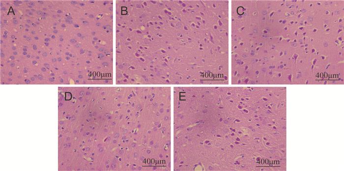 | A:Con组;B:Mod组;C:ML组;D:MM组;E:MH组 图 1 皮层HE染色形态学特征(×400) Figure 1 The pathologic change in cerebral cortex by HE(×400) |