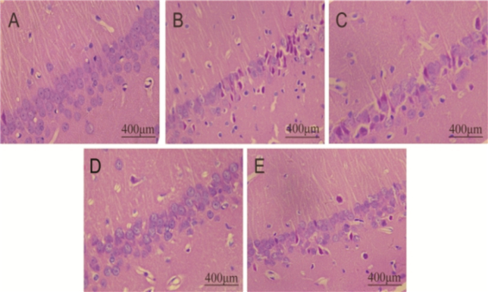 | A:Con组;B:Mod组;C:ML组;D:MM组;E:MH组 图 2 海马CA1区HE染色形态学特征(×400) Figure 2 The pathologic change in hippocampus CA1 by HE(×400) |