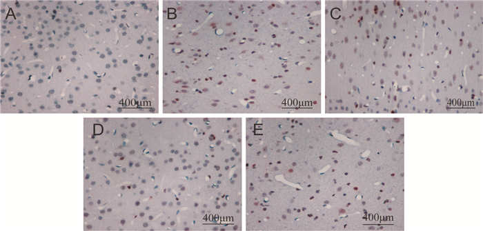 | A:Con组;B:Mod组;C:ML组;D:MM组;E:MH组 图 3 大鼠皮层TUNEL染色(×400) Figure 3 Apoptosis of cerebral cortex by TUNEL(×400) |