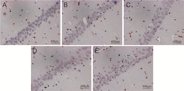 | A:Con组;B:Mod组;C:ML组;D:MM组;E:MH组 图 4 海马CA1区TUNEL染色(×400) Figure 4 Apoptosis of hippocampus CA1 by TUNEL(×400) |