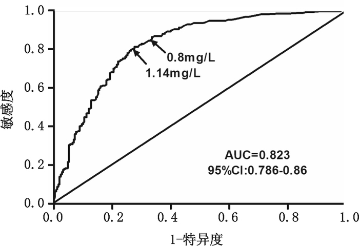 以250例AAD患者为病例组,250例非AAD患者为对照组,绘制D-二聚体诊断AAD的ROC曲线,曲线下面积为0.823,面积标准误为0.019,P < 0.01,95%CI:0.786~0.86,0.5落在95%可信区间外,差异有统计学意义。当D-二聚体浓度为0.8 mg/L时(本院检验报告正常值上限),诊断AAD的敏感度、特异度、阳性预测值、阴性预测值分别为86.4%、66.4%、72%、83%;当D-二聚体浓度为1.14 mg/L(约登指数为最大值时所对应的D-二聚体浓度值)时,诊断AAD的敏感性、特异性、阳性预测值、阴性预测值分别为81.2%、72.4%、74.63%、79.39%。见图 1。