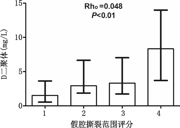 250例AAD患者中71例患者无本院主动脉CTA,对剩余的179例患者主动脉CTA进行评分,同时与患者血D-二聚体浓度的关系进行分析:评分1分(n=47)、2分(n=34)、3分(n=56) 和4分(n=42) 相对应的血D-二聚体浓度的中位数(P25, P75)分别为1.52(0.53~3.63) mg/L、2.94(1.85~6.66) mg/L、3.32(1.73~7.03) mg/L和8.34(3.69~13.99) mg/L,D-二聚体浓度和假腔撕裂范围评分的Spearman相关系数r为0.418 (P < 0.01),即D-二聚体浓度和主动脉夹层假腔撕裂范围呈正相关。见图 2。