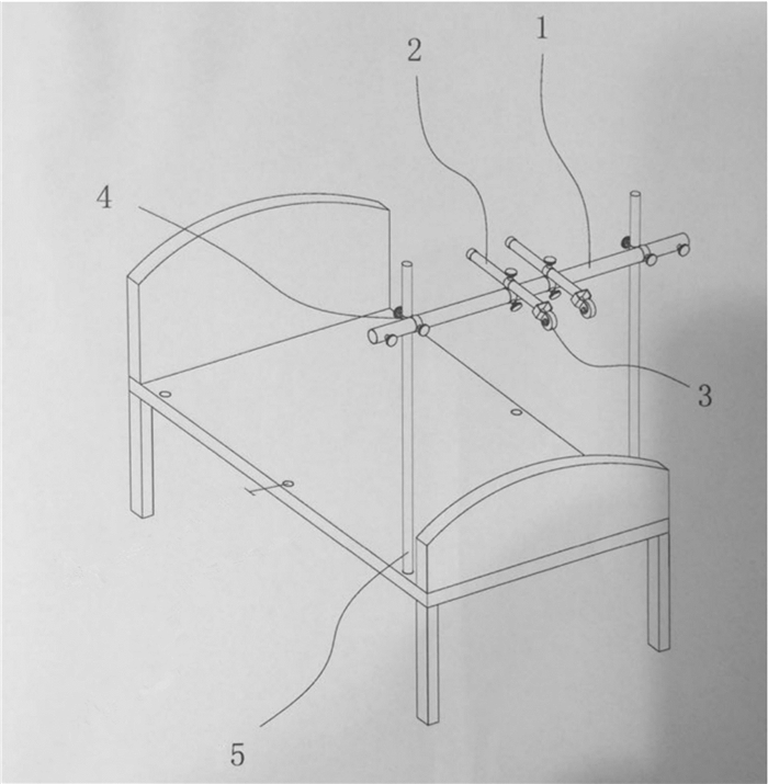 图 1 1-不锈钢主杆,2-不锈钢支撑架,3-滑轮,4-螺旋与不锈钢管“8”固定器,5-输液架或钢管