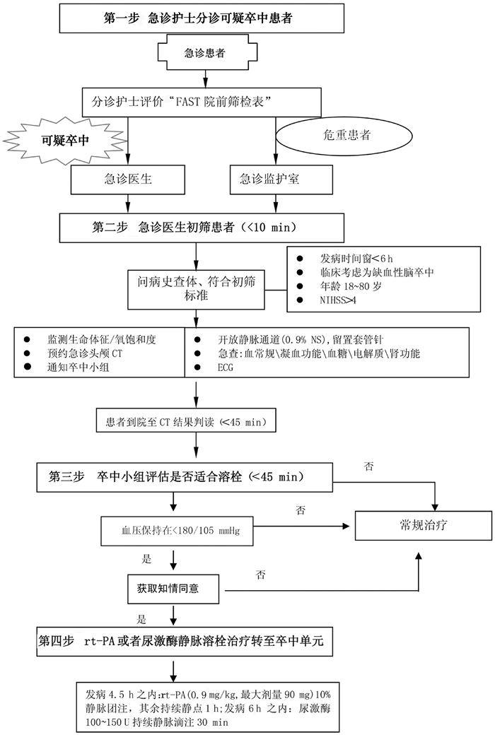 | 急诊一线医生 | 初筛、纳入“绿色通道”患者;通知溶栓二线医生;通知护士开放静脉通道;开具头颅影像、实验室化验检查;完成心电图 |
