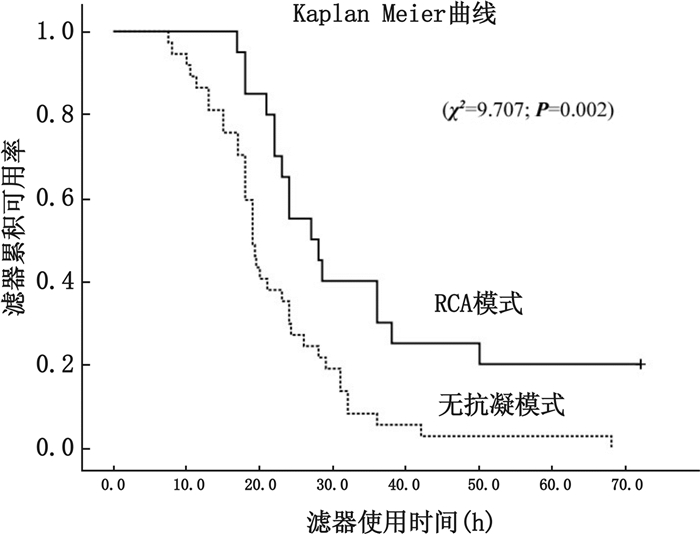Abstract: Objective To explore the advantages and disadvantages of regional citrate anticoagulation (RCA) mode by comparing to non-anticoagulation mode for continuous renal replacement therapy (CRRT) in patients with acute kidney injury (AKI) at high risk of bleeding. Methods The criterion for inclusion of patients was stage 3 of AKI selected according to Kidney Disease Improving Global Outcomes guideline.And those patients had high risk factors of bleeding as well as such as post-major opertion, coagulopathy (prothrombin time or activated partial thromboplastin time>1.5 times the normal control, or prothrombin time >18 s, activated partial thromboplastin time>60 s), thrombocytopenia ( < 50×109/L), and combined therapy with anticoagulant, antiplatelet or thrombolytic drugs. The CRRT was initiated within 4 h after randomization. The exclusion criteria was severe liver failure (serum total bilirubin > 171 μmmol/L). Continuous venovenous hemodiafiltration mode was employed in both groups, and the filter was changed routinely every 72 h, unless clotting developed in the extracorporeal circuit. Because the commercial calcium-free dialysate was not available in the market, this dialysate was prepared by the intensive care unit (ICU) nurses. Results Thirty two patients were equally divided in those two groups, and most of them were admitted to ICU after major surgery. There were no significant differences between the groups in data of blood gas analysis, hepatic/renal/coagulative functions, electrolyte, hemoglobin and platelet count before or after CRRT. The filter was more durable in RCA mode than that in non-RCA mode determined through Kaplan-Meier curve analysis (χ2=9.707, P=0.002), with the mean time (h) 36.01(26.61-45.42) vs. 22.04(18.35-25.73). More packed red blood cells and platelet were required in non-RCA mode than those in RCA mode during CRRT. There was no significant difference in ICU mortality between RCA mode and non-RCA mode with 7/16 vs. 9/16, P=0.724. Severe blood loss and malignant arrhythmia events did not occur in both modes. The body temperature, systemic electrolyte, post-filter ionized calcium levels and the ratio of total to ionized systemic calcium were basically preserved at a target range in RCA group during CRRT. Conclusions RCA-CRRT is a safe and effective mode for AKI patient with high risk of bleeding, which can extend the durability of filter, and lower the risk of blood loss. However, the study failed to show a mortality benefit with the RCA mode, and it could also increase the workload of nurses under the current domestic setting.
