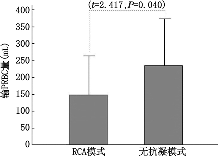 图 2 两组患者行CRRT期间输浓缩红细胞(PRBC)量的比较 Figure 2 The comparison of the volume with packed red blood cells (PRBC) infusion during continuous renal replacement therapy