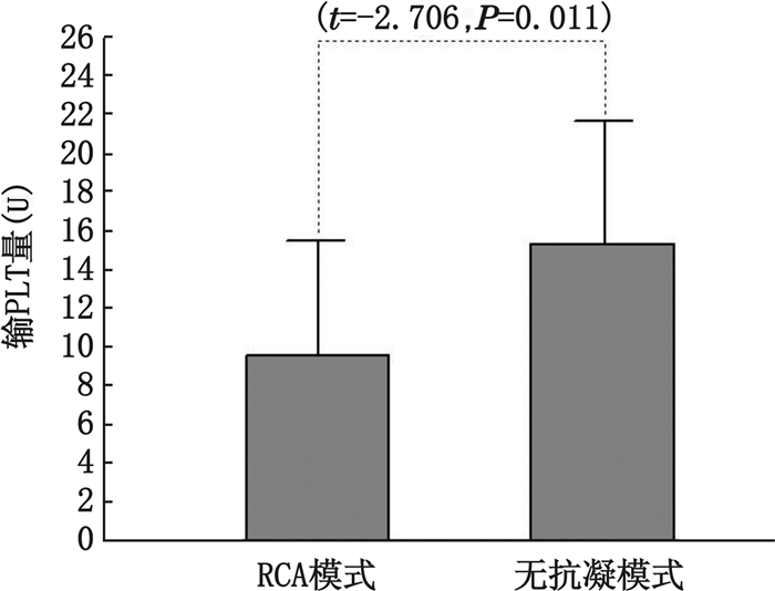 图 3 两组患者行CRRT期间输血小板(PLT)量的比较 Figure 3 The comparison of the volume with platelet infusion during continuous renal replacement therapy