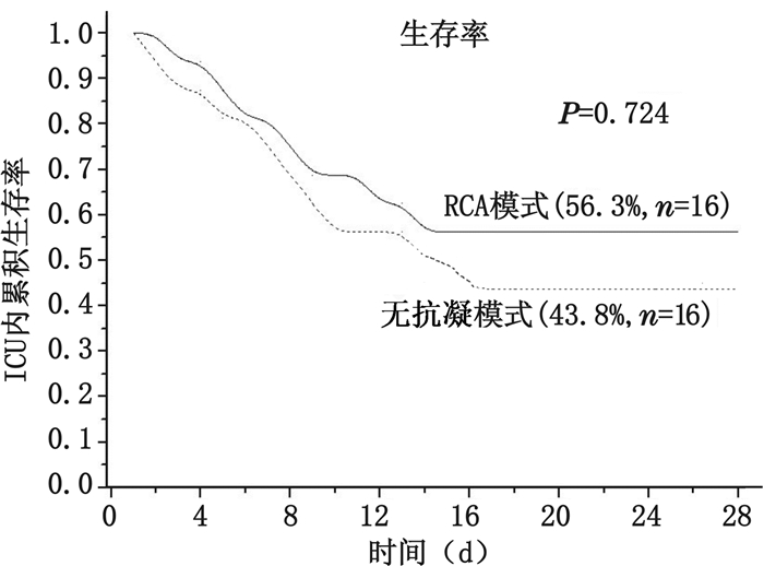 通过Kaplan-Meier曲线分析,RCA组患者行CRRT时其单个滤器使用时间较无抗凝组更长(χ2=9.707,P=0.002,图 1);单个滤器使用的时间(h)为36.01(26.61~45.42) 和22.04(18.35~25.73)。无抗凝组在CRRT期间较RCA组需输更多的浓缩红细胞量(mL)[242.5(173.1~311.9) 和148.8(86.7~210.8),t=-2.417,P=0.040]与血小板量(U)[15.4(12.0~18.7) 和9.4(6.2~12.7),t=-2.706,P=0.011](图 2~3)。RCA组与无抗凝组患者ICU内病死率差异无统计学意义,7/16和9/16(P=0.724,图 4)。两组患者行CRRT期间均未发生严重失血与恶性心律失常事件。