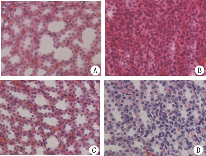 | A:正常组;B:染毒组;C:PON-1 预处理组;D:传统解救组 图 1 各组大鼠肾脏形态学变化(HE×400) Figure 1 Changes of renal morphology of each groups(HE×400) |