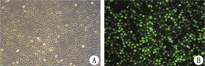2 结果 2.1 PMVECs形态以及感染率大鼠PMVECs呈梭形、椭圆或多边形,细胞质丰富,可见典型“铺路石样”排列生长(图 1A)。重组腺病毒在MOI值=50时,对大鼠PMVECs的感染率约为95%(图 1B)。