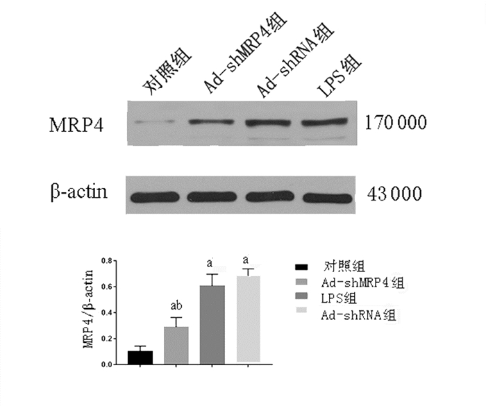 与对照组相比,其余组蛋白表达水平显著上调(P<0.05);与LPS组比较,Ad-MRP4组蛋白表达水平明显下调,差异有统计学意义(P<0.05)。见图 2。