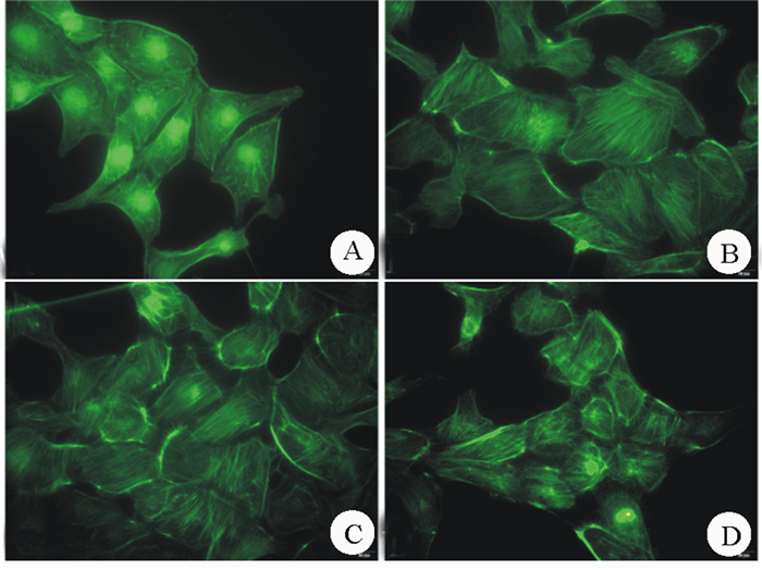 | A:对照组;B:LPS组;C:Ad-shRNA组;D:Ad-shMRP4组 图 3 大鼠PMVECs的F-actin形态 Figure 3 F-actin morphology of rat PMVECs |